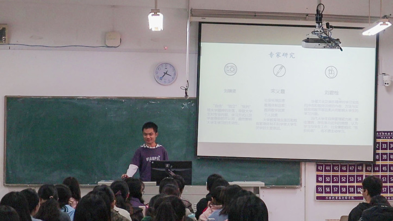 课上,冯济韬同学由厌学现象引入话题,由浅入深,详细地向大家讲述了学生、教师、家长在大学生学习教育和培养中产生的困惑,从内部与外部分析了原因,提出了解决措施。并联系生活实际,与同学们积极互动,同学们反响热烈。