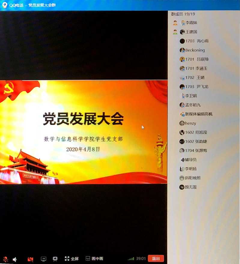 4月8日下午3点,我院学生党支部利用线上直播的方式顺利召开学生党员发展大会。支部全体党员、六名发展对象以及入党介绍人张胜伟、李明扬、颜无瑕三位老师一同参加了大会。会议由学生党支部书记李霞妹老师主持。