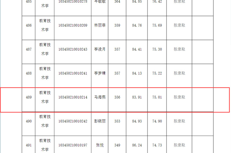 5月19日,浙江师范大学教师教育学院公布了2020年硕士研究生统考招生拟录取名单,我院16级教育技术学专业学生马海燕拟被浙江师范大学教师教育学院教育技术学专业录取。