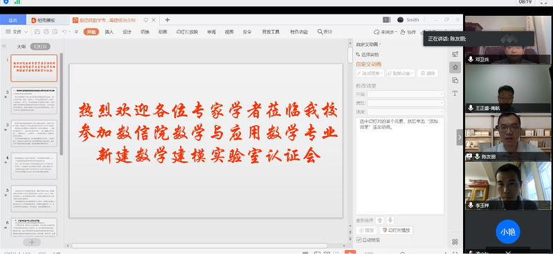 为了更好的培养学生的实践实训能力,提高学生数学建模实力,辅助学生完成毕业生设计、课外拓展项目等实验,搭建学生创新创业实践基地,我院于6月1日19:00,数学与信息科学学院通过网络召开了数学与数学应用专业数学建模实验室“云论证”会,邀请了我校党委常委、副院长陈克军教授,教务处处长杨枫教授,科研处处长王兵教授,南京大学数学系副主任邓卫兵教授,东南大学李玉祥教授,南京航空航天大学理学院副院长王正盛教授参加了论证会,会议由学院副院长张居晓主持。