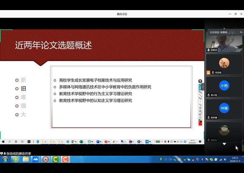 2020年6月5日下午,数学与信息科学学院邀请盐城师范学院张德成副教授给教育技术学专业师生开展“教育技术的毕业论文选题遴选”专题讲座。讲座由学院教学副院长张居晓副教授主持,2017级教育技术学专业毕业论文指导老师及学生代表聆听了讲座。