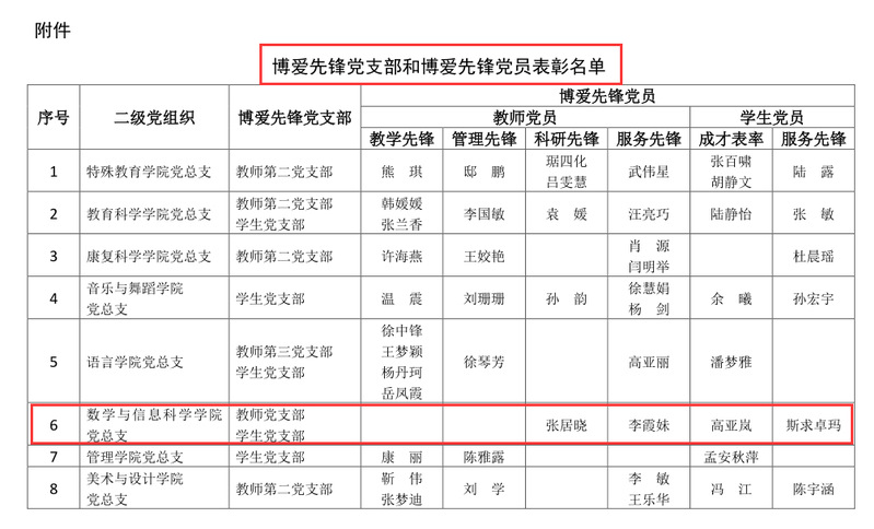 根据《关于表彰“博爱先锋党支部”和“博爱先锋党员”的通知》(南特师委〔2020〕76号)文件,我院教师党支部、学生党支部均被授予校“博爱先锋党支部”,我院党员张居晓、李霞妹、高亚岚、斯求卓玛授予“博爱先锋党员”称号。