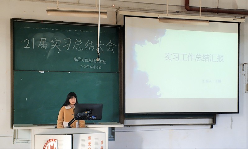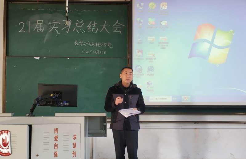 2020年12月25日,数学与信息科学学院在博远楼306举办2021届实习总结大会。大会由该院副院长张居晓主持,副院长(挂职)陈仲珊、教师陈友朋、仇玉洁、辅导员樊琬以及2021届教育技术学和计算机科学与技术两个专业共167名学生参加了大会。