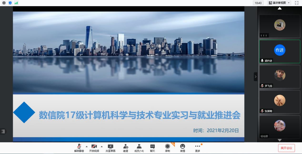 为了进一步推进毕业生就业工作,最大限度降低新冠肺炎疫情对毕业生就业工作带来的冲击和影响,2021年2月20日上午,我院线上召开了17级计算机科学与技术专业实习与就业推进会。会议由我院学生辅导员樊琬老师主持,胡作进院长、李宏伟书记、张居晓副院长、蒋贤维主任和各班学生代表参加了此次会议。