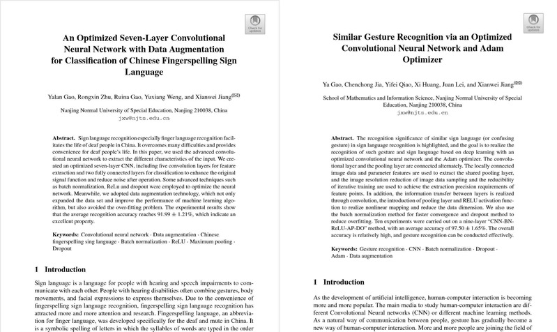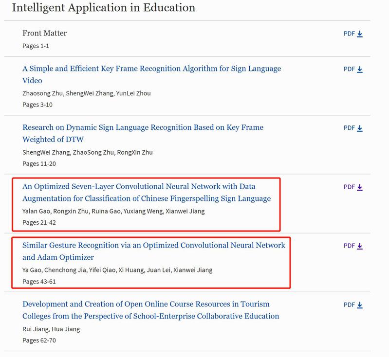 本次会议不仅关注人类教育相关的学习,还特别关注了机器学习技术。数学与信息科学学院学生运用深度学习技术对中国手语识别展开研究,发表了两篇学术研究论文。其中,2018级学生高亚岚、高瑞娜、翁宇翔发表了论文“An Optimized Seven-Layer Convolutional Neural Network with Data Augmentation for Classification of Chinese Fingerspelling Sign Language”,用优化的七层卷积神经网络加数据增强技术来分类识别中国手语手指语。此外,2018级学生高雅、贾成冲、乔懿飞和2019级同学黄袭、雷娟合作发表了论文“Similar Gesture Recognition via an Optimized Convolutional Neural Network and Adam Optimizer”,用优化的卷积神经网络和优化训练算法实习了对相似手势的识别。目前,这两篇论文已经正式上线并出版,将被Ei Compendex, ISI Web of Science, Scopus, CrossRef, Google Scholar, DBLP等多个索引服务检索。(蒋贤维)