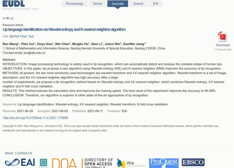 近日,我院王冉、崔艺凡、陈威、胡明波、李茜、高心语、魏佳慧等同学采用小波熵和k近邻算法实现了对唇语图像的初步识别,撰写了题为“Lip Language Identification via Wavelet Entropy and K-nearest Neighbor Algorithm”的学术研究论文。