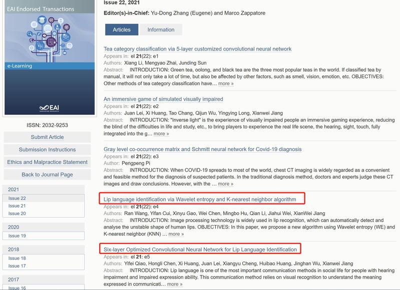 这两篇文章基于迁移学习的思想,借助了已有的研究积累,数学与信息科学学院两个团队的同学们,将手语图片识别的方法和模型运用到唇语识别上,进行了大胆的尝试,最终取得了成果。目前,这两篇论文已经被欧洲学术期刊e-Learning出版。(蒋贤维)