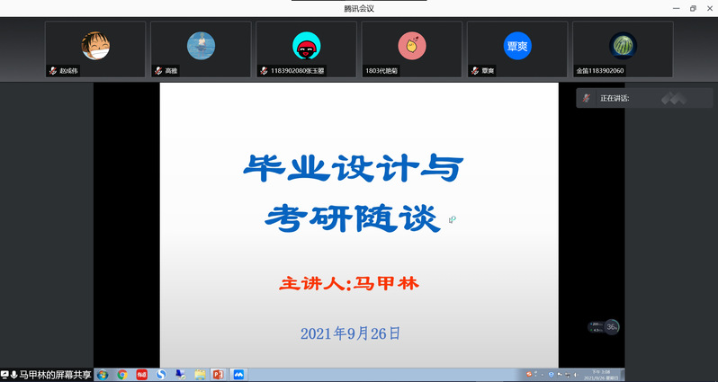9月26日下午,数学与信息科学学院邀请淮阴工学院马甲林老师开展线上“计算机专业毕业论文撰写及考研随谈”讲座,本次讲座由副院长张居晓主持,2018级计算机科学与技术(嵌入式培养)专业的学生全程参加讲座。