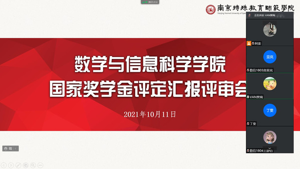 10月11日,数学与信息科学学院于线上开展2020-2021学年国家奖学金评定汇报评审会议。本次评审会由数信院辅导员樊琬老师主持,学院党总支副书记丁雯和全体辅导员组成奖学金评审小组参与了会议。