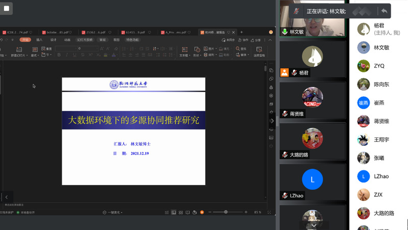 在会上,林文敏博士首先介绍了大数据的发展历程,分析了大数据发展对推荐技术带来的机遇和挑战,随后,林博士结合大数据推荐技术的学术前沿和他本人的最新的研究成果,详细讲述了大数据环境下基于多源信息融合和隐私保护两方面的协同推荐方法。林博士的讲座聚焦大数据技术发展的前沿,内容新颖,极具理论指导和实践参考意义,进一步激发了数据科学与大数据技术教研室老师的科研兴趣和科研动力。在互动环节,老师们与林博士进行了学术探讨与交流。