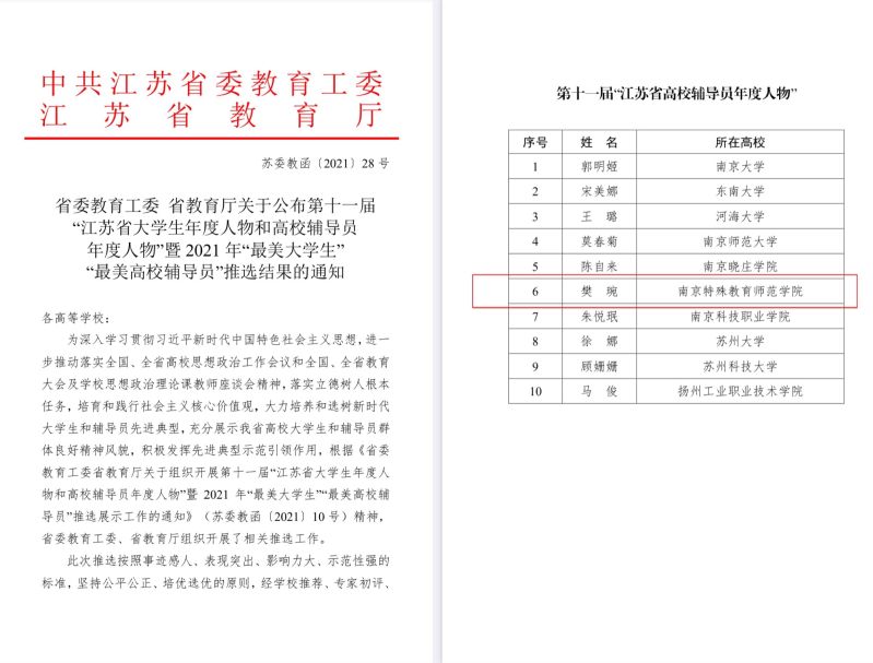 近日,江苏省委教育工委、江苏省教育厅公布了第十一届“江苏省大学生年度人物和高校辅导员年度人物”暨2021年“最美大学生”“最美高校辅导员”推选结果,我校辅导员樊琬老师荣获第十一届“江苏省高校辅导员年度人物”。