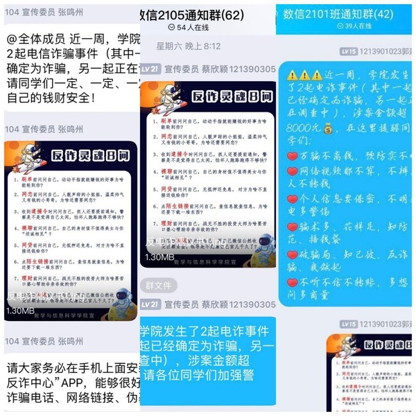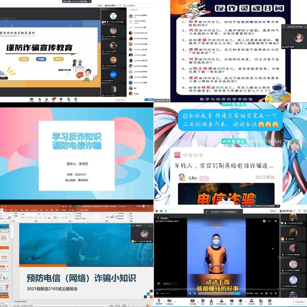 近日,高校电信诈骗事件频发,新型电信诈骗的手段也层出不穷,接踵而来,为进一步提高学院新生对于电信诈骗的防范意识,保护同学们的财产安全,杜绝此类问题的发生。3月26日-4月初,21级新生班级陆续开展一系列反诈骗主题线上宣传教育活动。活动由各班宣传委员主持,党总支副书记丁雯、辅导员张国盛及全体学生参与。