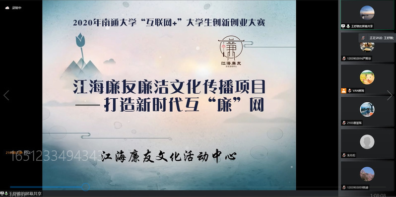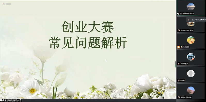 会议开始前,辅导员樊琬老师带领同学们学习了“双创”大赛相关文件要求,强调了关键的注意事项、提交材料的时间节点等。张院长向同学们介绍了王舒雅教授的部分研究成果和个人事迹。王舒雅教授以2020年全国“互联网+”大学生创新创业金奖项目“江海廉友廉洁文化传播项目——打造新时代互‘廉’网”为切入点,向同学们展示了参赛项目ppt与计划书,用“为什么要做”、“为什么能做”、“需要做什么”、“做得怎么样”几个问题串联了参赛材料的各项关键要素,并对常见问题进行了解析,用“四看”、“三最”总结出创新创业比赛前期选题与准备的要点。