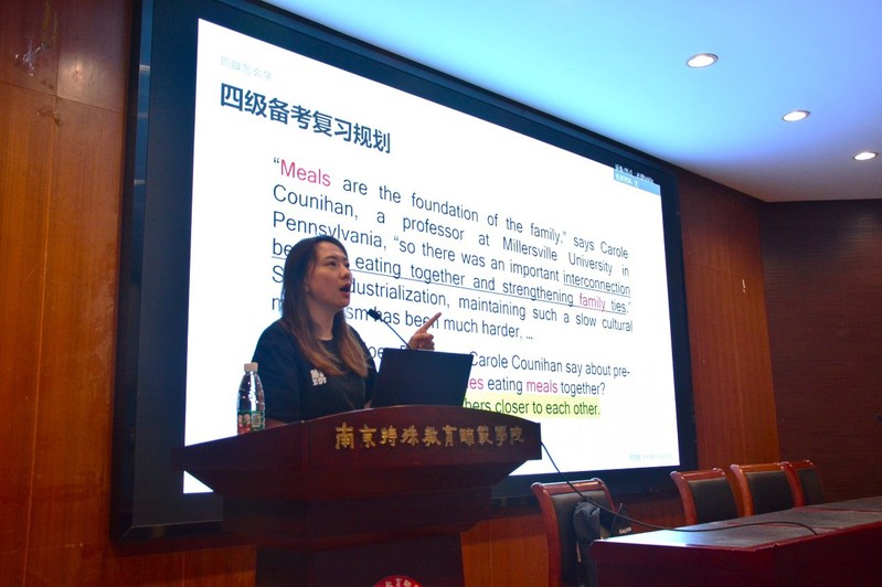 王雅洁老师首先向大家介绍了四级考试的基本情况,包括题型设置、分值比例、复习时间轴和考试流程等,帮助同学们了解四级考试的测试内容和形式。接着,她围绕四级考前复习规划,有针对性地为同学们指明了应对四级考试的策略,详细讲解了各种类型题目的做题技巧,并结合自身经历强调,考试期间要合理分配答题时间,注意停止答题和收答题卡的时间。讲座最后,王雅洁老师预祝大家都能顺利通过本次四级考试。