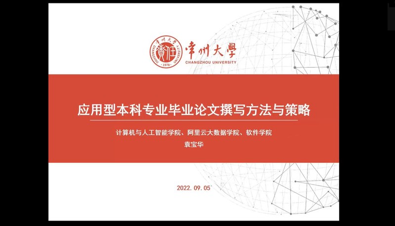 为进一步提高2019级计算机科学与技术专业毕业论文写作能力,提高学生论文撰写质量,9月14日上午,数学与信息科学学院特别邀请常州大学硕士生导师、副教授袁宝华老师,面向2019级计算机科学与技术毕业生,开展了《应用型本科专业毕业论文撰写方法与策略》线上讲座。
