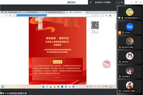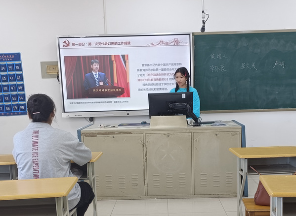 会上,学工办负责人樊琬带领同学们共同学习了中国共产党南京特殊教育师范学院第二次党员代表大会工作报告:总结回顾了党委工作报告中总结的第一次党代会以来我校所取得的成就以及从中所获的经验及启示;重点解读了学校提出的“一二三四五”中长期发展战略、“两步走”奋斗目标和今后五年学校将着力实施的“八大提升工程”。樊琬老师强调,要坚持党对学校各项工作的全面指导,当代青年应和衷共济、踔厉奋发、团结奋斗,勇担新时代赋予的光荣使命。