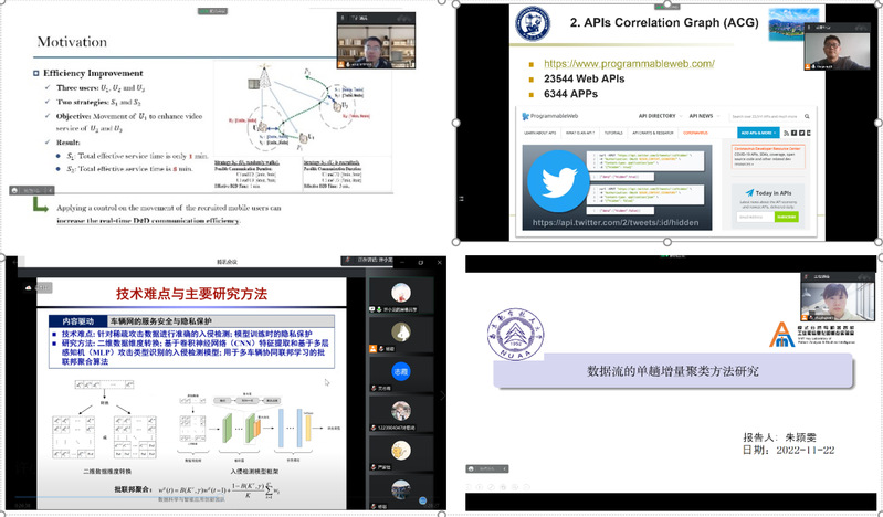 2022年11月22日晚,数学与信息科学学院大数据专业举办学术交流会,中国石油大学(华东)齐连永教授/博士生导师、南京信息工程大学许小龙教授/博士生导师、南京师范大学吴小同博士、南京航天航空大学朱颖雯博士针对大数据专业相关前沿技术分别就《Compatibility-aware Personalized Web APIs Recommendation for Mobile APPs Development》、《多场景行业大数据驱动的智能服务创新》、《Crowdsourcing-based Multi-Device Communication Cooperation for Mobile High-Quality Video Enhancement》和《数据流的单趟增量聚类方法研究》做了专题报告。