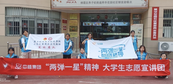 2023年中核集团联合全国高校大学生志愿者开展了核工业的宣传,我校数学与信息科学学院“星”火相传宣讲团承担了“两弹一星”精神的宣讲任务。宣讲团于6月29日赴南京市栖霞区燕华花园开展新时代习书记人才强国战略——北山“万年级”工程(新时代的核工业人才)主题宣讲活动,并于6月30日赴南京市栖霞区祥和雅苑社区委员会开展“习近平生态文明思想理论——‘人造太阳’,点亮能源梦想”主题宣讲活动。社区人民、党员积极参与,与会人数五十余人。