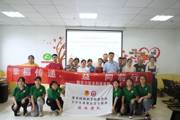 7月7日下午,南京特殊教育师范学院数学与信息科学学院联合燕子矶残疾人之家举行大学生社会实践基地签约挂牌仪式。燕子矶残疾人之家负责人贾伟东、南京特殊教育师范学院数学与信息科学学院党总支副书记丁雯、 “益桔”同行实践团成员以及燕子矶街道残疾人之家学员出席本次挂牌仪式。会议由数学与信息科学学院团总支书记、学工办主任樊琬老师主持。