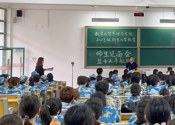 2023年9月20日,数学与信息科学学院召开2023级师生见面会暨专业导航教育活动。学院党总支书记李贵希,院长王兵,党总支副书记丁雯,副院长陈仲珊,副院长孙计领,教育技术学系主任刘艳菊,计算机科学与技术系主任蒋贤维,数据科学与大数据技术系主任杨君,数学与应用数学系教师王翔宇,2023级新生辅导员李昀熹、朱思橙以及2023级全体新生参加本次会议。会议由2023级新生辅导员朱思橙主持。