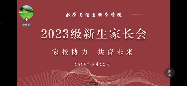 为了更好搭建家校协同育人平台,完善家校沟通机制,提升高校育人质量,9月22日,数学与信息科学学院召开主题为“家校协力,共育未来”的2023级新生家长会,数学与信息科学学院党总支书记李贵希、数学与信息科学学院院长王兵、数学与信息科学学院党总支副书记丁雯出席和213名学生家长云端会面。