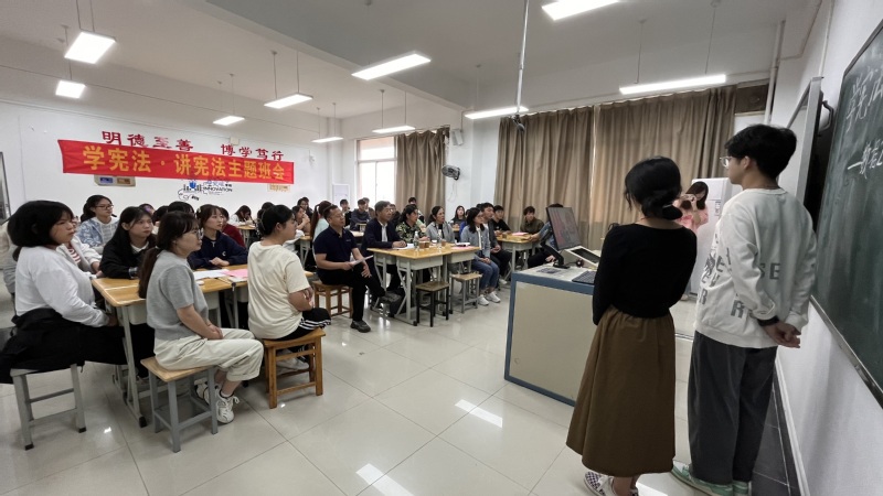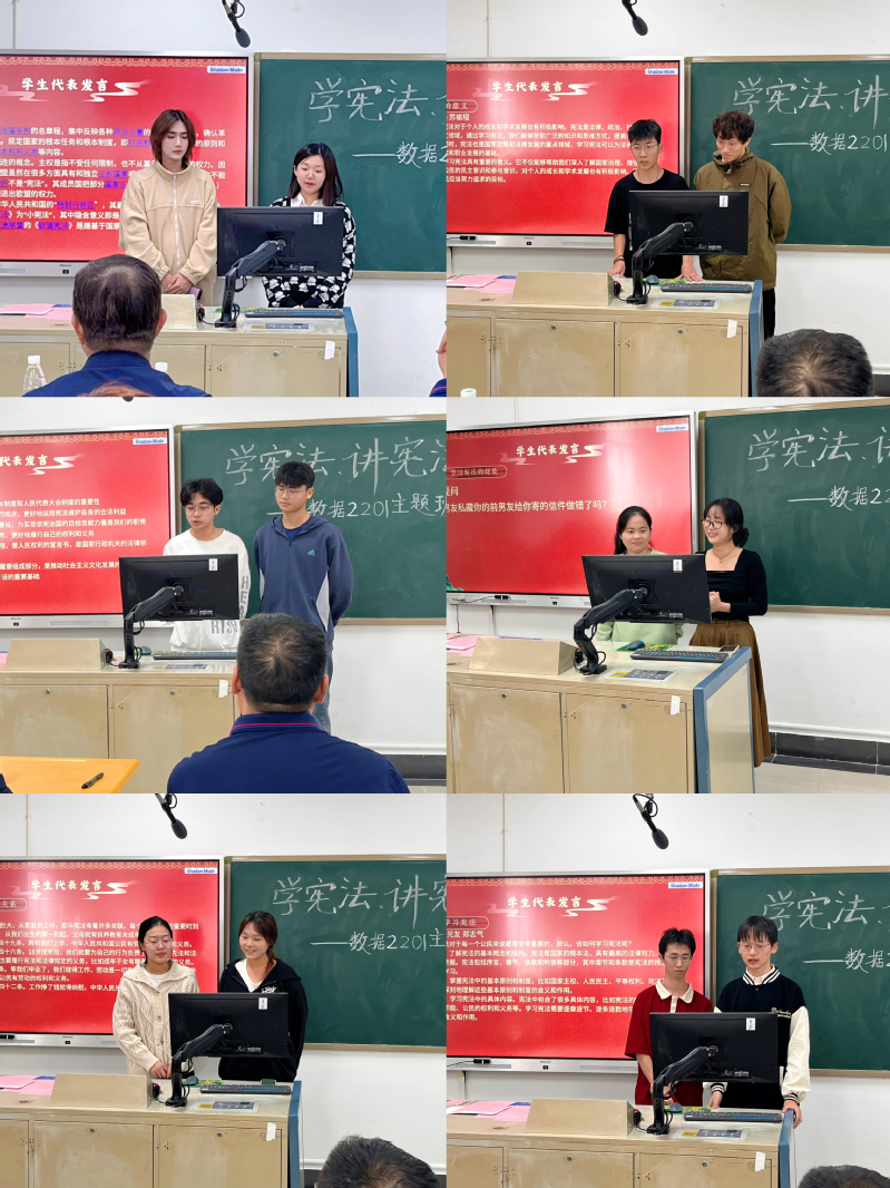 此次学宪法、讲宪法主题班会以“班主任宣教+学生讨论分享+嘉宾点评指导”模式进行。班会开始阶段,班主任杜文老师结合视频播放,从国家建设对法治的要求和宪法对当代青年大学生个人成长、成才的意义这两个方面给学生进行了导学。他强调,全面推进依法治国、建设良法善治的法治中国是新时代法治追求和国家各项事业发展的保障,学习宪法、尊崇宪法、信仰宪法对提升青年大学生法治素养具有重要价值。