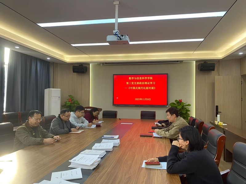 11月9日下午,数学与信息科学学院教师第三党支部在博雅楼3601会议室,召开《中国式现代化面对面》集中学习研讨会,支部全体教师党员参加了会议,会议由第三党支部书记王立平主持。学院李贵希书记到场指导。