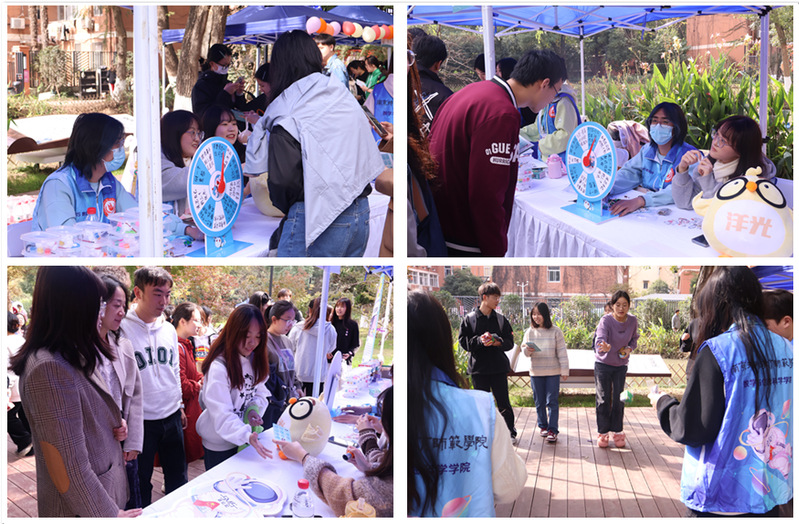 我院在本次游园会共设置了“心情大转盘”和“心韵投手”两个项目,项目寓教于乐,将心理知识融于有趣好玩的竞答游戏中,兼具趣味性和挑战性,意在通过有奖竞答、趣味游戏、现场体验性活动等方式引导在校大学生学会表达日常情绪、情感,释放压力,关注心理健康。