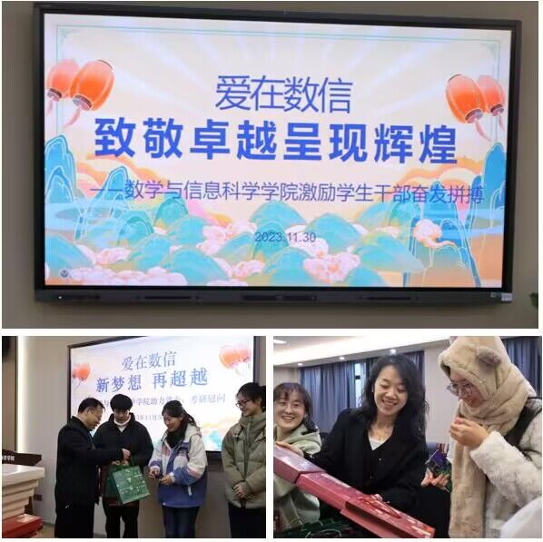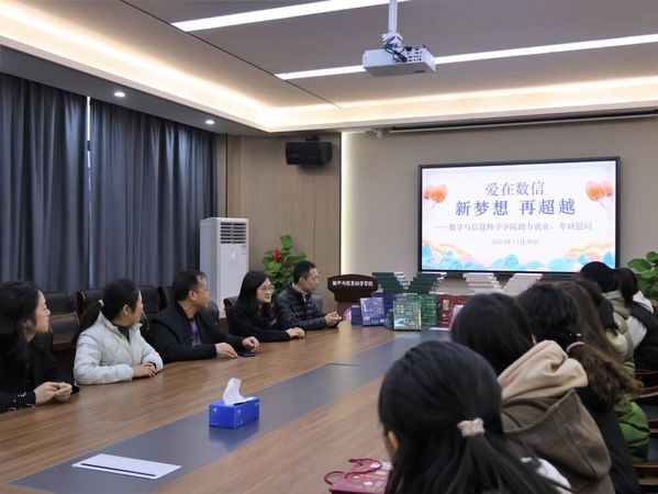 为鼓励考研学子增强考研信心,舒缓备考压力,积极迎接考试,11月30日下午,数学与信息科学学院于博雅楼3601开展“研”途有你,一“研”为定——2024届考研学子慰问活动。我院党总支书记李贵希、副书记丁雯、副院长陈仲珊、学工办主任樊琬和辅导员张国盛前来为考研学子加油鼓劲。