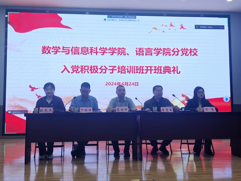 4月24日下午,数学与信息科学学院、语言学院2024年第一期分党校开班典礼在栖霞校区博远楼106和江宁校区B101分会场举行。校党委组织部副部长庞宙华、数学与信息科学学院党总支书记李贵希、语言学院党总支书记丁祖保、数学与信息科学学院党总支副书记丁雯、语言学院党总支副书记张冬冬、数学与信息科学学院学生第二党支部书记丁力、语言学院学生第一党支部书记杨菊鑫以及江宁校区分会场辅导员朱思橙、李昀熹出席本次开班典礼。会议由数学与信息科学学院党总支书记李贵希主持,全体入党积极分子参会。