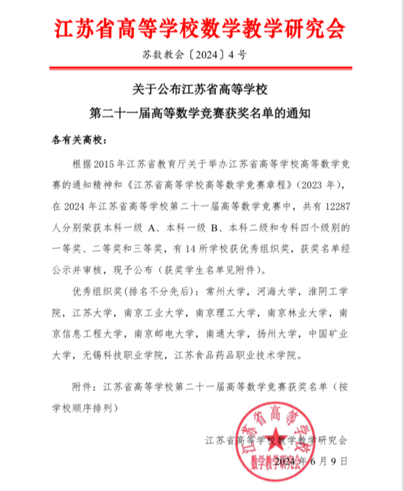 近日,江苏省高等学校第二十一届高等数学竞赛在全省各大高校隆重举行。我校数学与信息科学学院数学系老师们辛勤付出、精心指导,带领学生们勇攀高峰,最终斩获了3个一等奖、11个二等奖和14个三等奖的辉煌成绩,创下了我校近五年来在该竞赛中的最佳纪录。