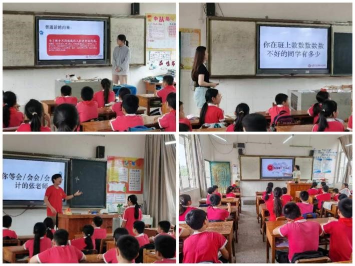 在广西柳州,团队深入乡村学校鹧鸪江小学和两合小学,助力普通话教育普及。团队成员精心设计了丰富多彩的活动,针对不同年级的学生开展“看图说话”“断句挑战”“绕口令挑战”等游戏,帮助孩子们提升语言表达能力。特别值得一提的是,团队成员还充分发挥了学校的专业优势,向学生们教授了简单的手语,这一特色教学不仅让孩子们感受到手语的魅力,也让普通话的普及工作更加生动有趣。活动期间,团队成员与鹧鸪江小学的书记曾冬菊、校长邱小玲,以及两合小学的书记覃春山、校长覃思贤进行了深入访谈。他们一致认为,普通话的推广是乡村教育的重要任务,“四海同音”团队的到来为这一任务的推进提供了强有力的支持。