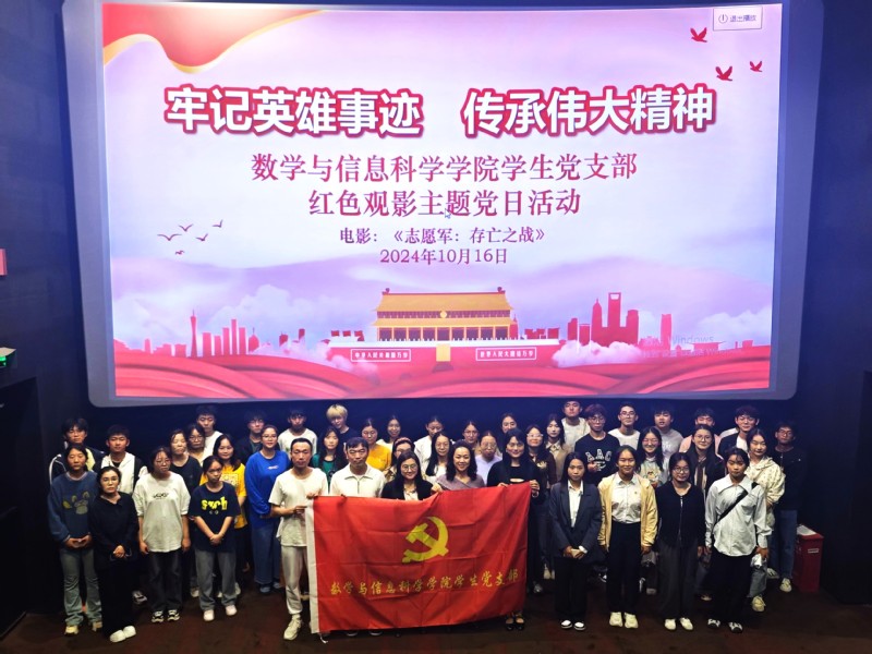 为庆祝中华人民共和国成立75周年,激发学生爱国热情,传承红色文化基因,强化政治责任感与历史使命感,数学与信息科学学院学生第一第二第三党支部于2024年10月16日组织支部党员和入党积极分子观看爱国题材电影——《志愿军:存亡之战》。活动共计53人参与,活动现场氛围浓厚,爱国主义教育成效显著。
