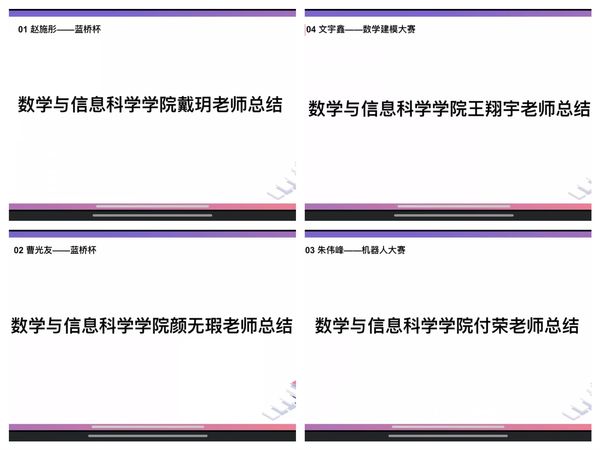 教育技术学专业学生赵施彤以“勇于尝试,方知前路宽阔”为主题,介绍团队以“蓝印花布”为灵感参加“NCDA未来设计师”大赛的创作经历,鼓励同学们以兴趣为导向选择比赛项目,大胆尝试;在数学建模竞赛上,数学与应用数学专业学生文宇鑫从团队组建、选题参考、能力提升和时间安排四个方面的建议;数据科学与大数据专业学生曹光友介绍了算法竞赛的相关内容,强调培养编程能力、逻辑思维能力的重要性;计算机科学与技术专业学生朱伟峰结合团队经验,从备赛、组队、调试与练习三个方面进行经验分享。