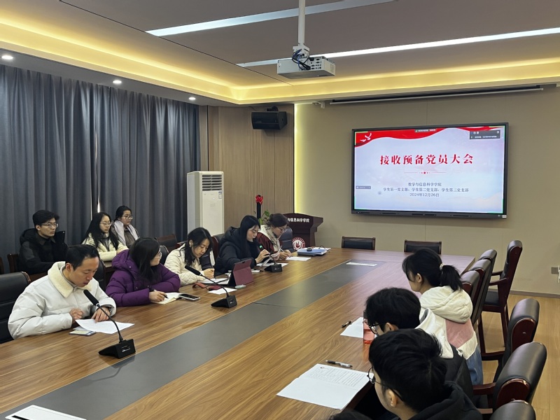 为促进党员队伍发展,加强党员队伍建设,进一步增强党员队伍的凝聚力和战斗力,12月26日上午,数学与信息科学学院学生第一、第二、第三党支部召开支部党员大会,讨论接收钟俊杰等9位同志为预备党员。学院党总支副书记丁雯、学生第一党支部书记张国盛、学生第二党支部书记樊琬、学生第三党支部书记李昀熹、辅导员丁力、朱思橙、入党介绍人代表以及支部全体党员参加会议。会议由学生第三党支部书记李昀熹主持。