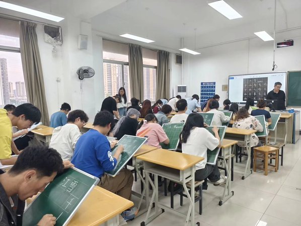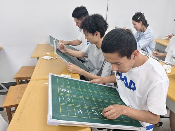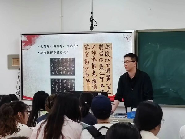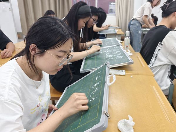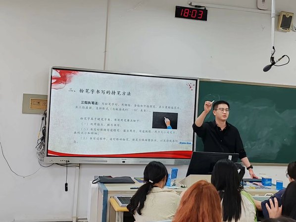 比赛邀请了美术与设计学院的金诚立老师和徐祥老师为参赛学生进行了钢笔字和粉笔字的赛前培训,培训内容涵盖了握笔姿势、笔画书写规范与技巧、排版等多个方面,老师们细致入微的讲解,为同学们的比赛书写打下了坚实的基础。